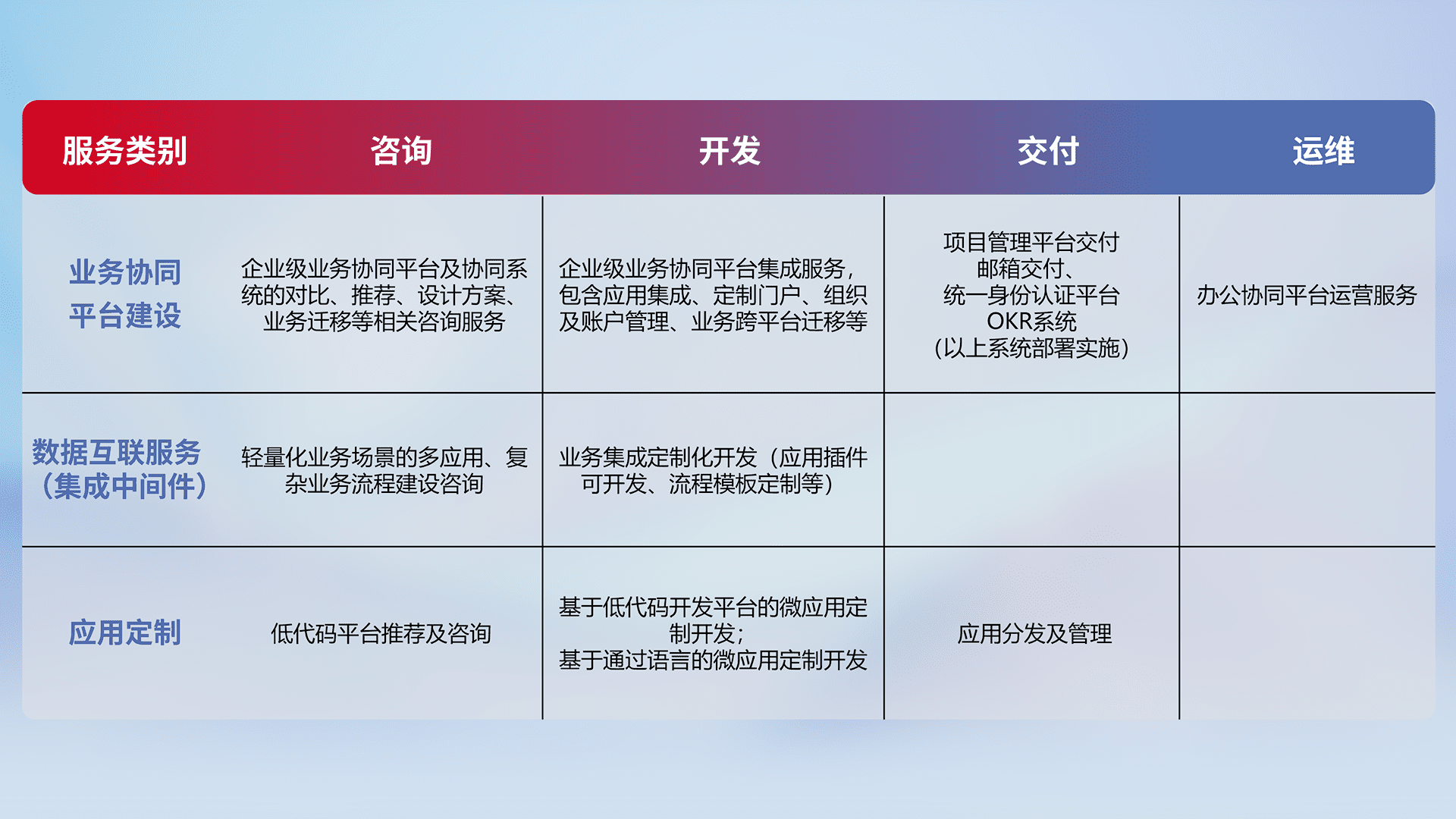 针对钉钉、、、、企微、、、、IDaas等平台级产品提供产品的规划、、、、方案、、交付、、定制化开发等服务,,,,实现如统一协同办公、、智能客户服务、、、、混合会议管理、、、、智能数据查询、、等业务场景,,,实现数字化转型。。。