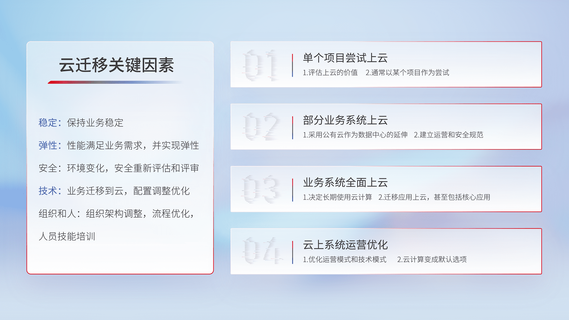 结合实际业务,,,,从规划设计、、云平台选型、、、云原生改造、、、、数据迁移、、、集成交付,,,,迁移全过程为客户识别最佳上云路径,,,做好风险识别管理,,,设计网络架构、、、身份权限、、安全审计合规、、、、操作审计、、、、日志审计、、、、监控告警策略、、多站点容灾设计等,,,,对云上基础设施进行整体规划,,提升IT治理水平,,,以满足弹性、、高可用、、、高性能的需求。。。