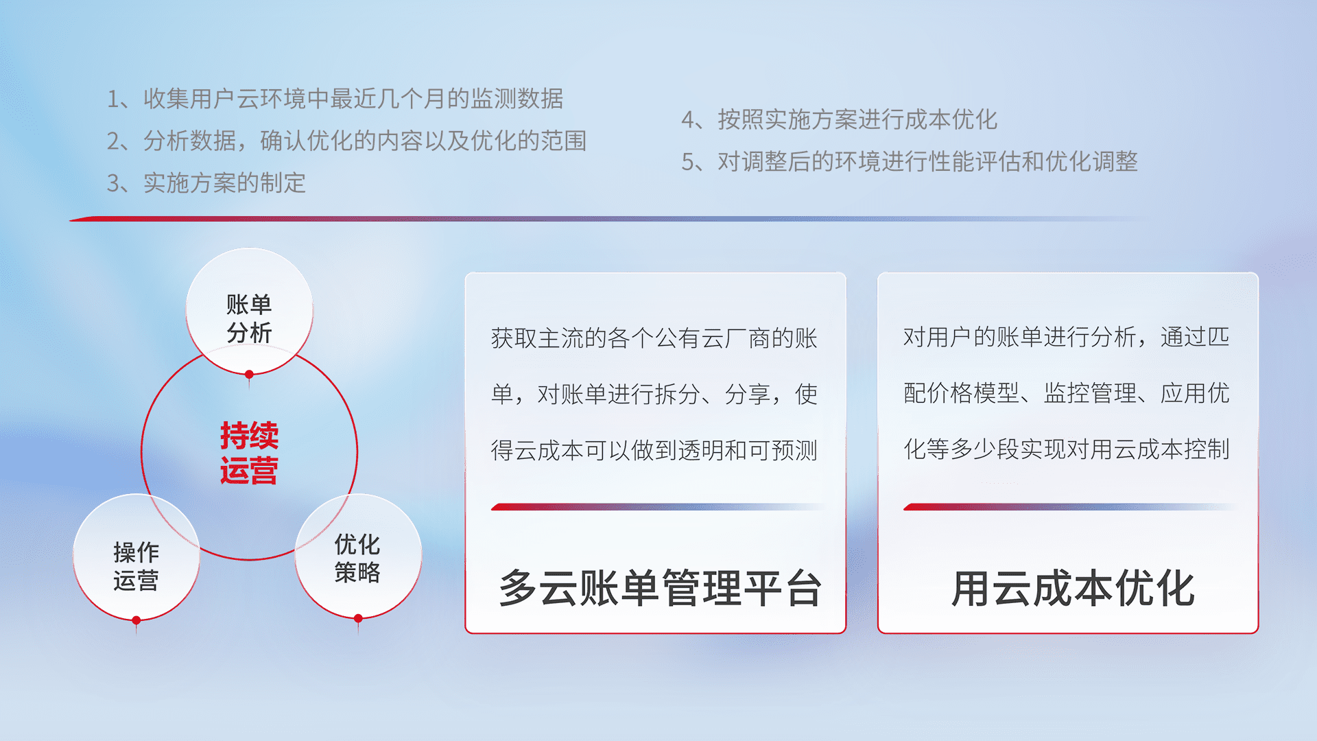 通过多云纳管,,,以统一的资源数据模型把客户的云资源进行抽象和封装,,,进而实现对多云资源的统一操作,,,保障云资源管理的可靠性、、稳定性与可用性。。。。量身定制化运维内容,,,,配置、、、开发运维、、补丁管理、、、备份、、、监控、、、认证和访问管理、、、、审计和日常巡检等,,,保障在用云过程中的可靠度,,,稳定度以及高可用率。。